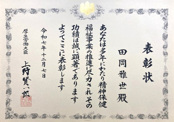 田岡雅世理事長が令和7年度精神保健福祉事業功労者厚生労働大臣表彰を受賞いたしました