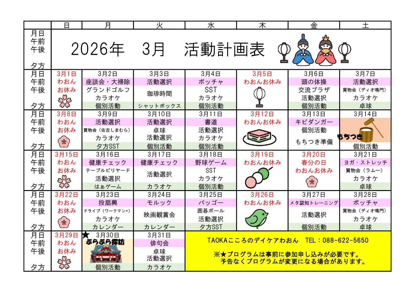 2026/03/04 最終更新日時 : 2026/03/04 taoka_master 精神科デイケア 3月の活動予定のお知らせ TAOKAこころのデイケアわおんの3月の活動予定をお知らせいたします。精神科デイケアをご利用希望される場合は、ご見学からでも可能ですのでお気軽にお問合せください。 お問い合わせ先 TAOKAこころのデイケアわおん直通TEL 088-622-5650 拡大して見る TAOKAこころのデイケアわおん紹介ページはこちらから