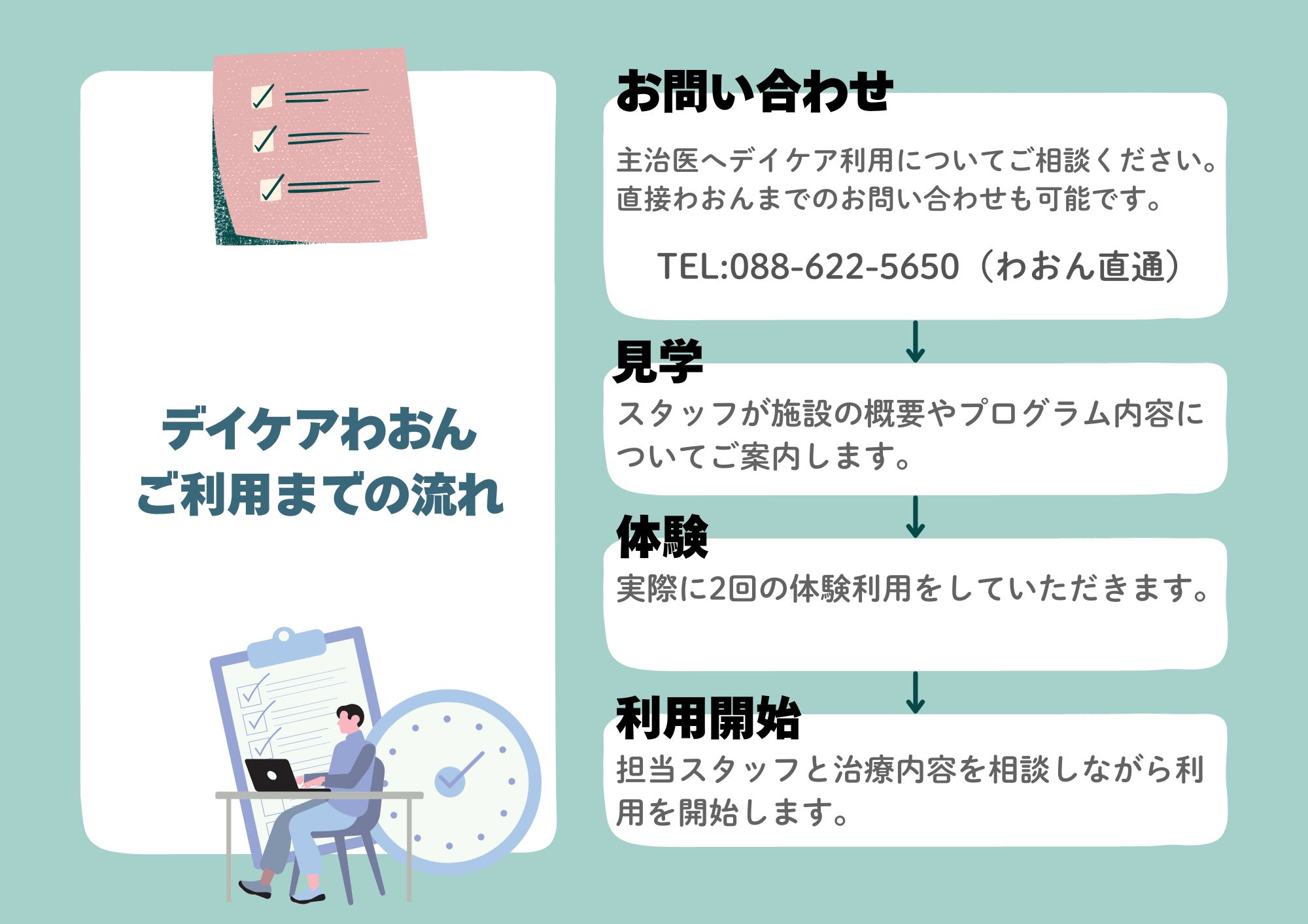 | TAOKAこころのデイケアわおん | TEL: 088-622-5650(直通) |