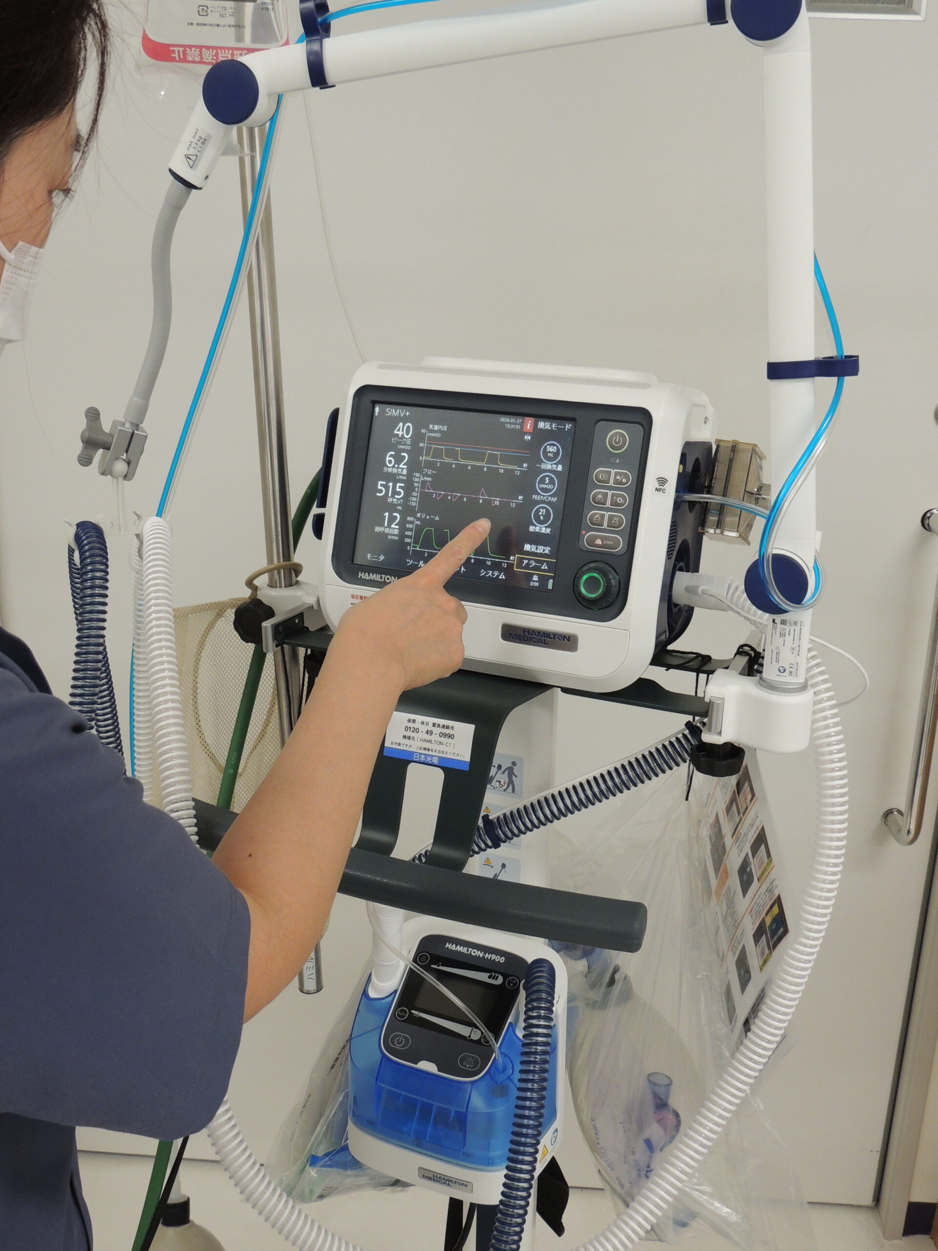 当院では分散管理方式を用いて医療機器を管理しています。人工呼吸器は6台、ネーザルハイフローは1台を保有しており、日常の使用前・中・後の点検を始め定期的なメンテナンスを含めた保守点検を行っています。他にも輸液ポンプ、シリンジポンプ、AED、除細動器、生体情報モニターなどのME 機器の点検や修理、保守管理も行っています。